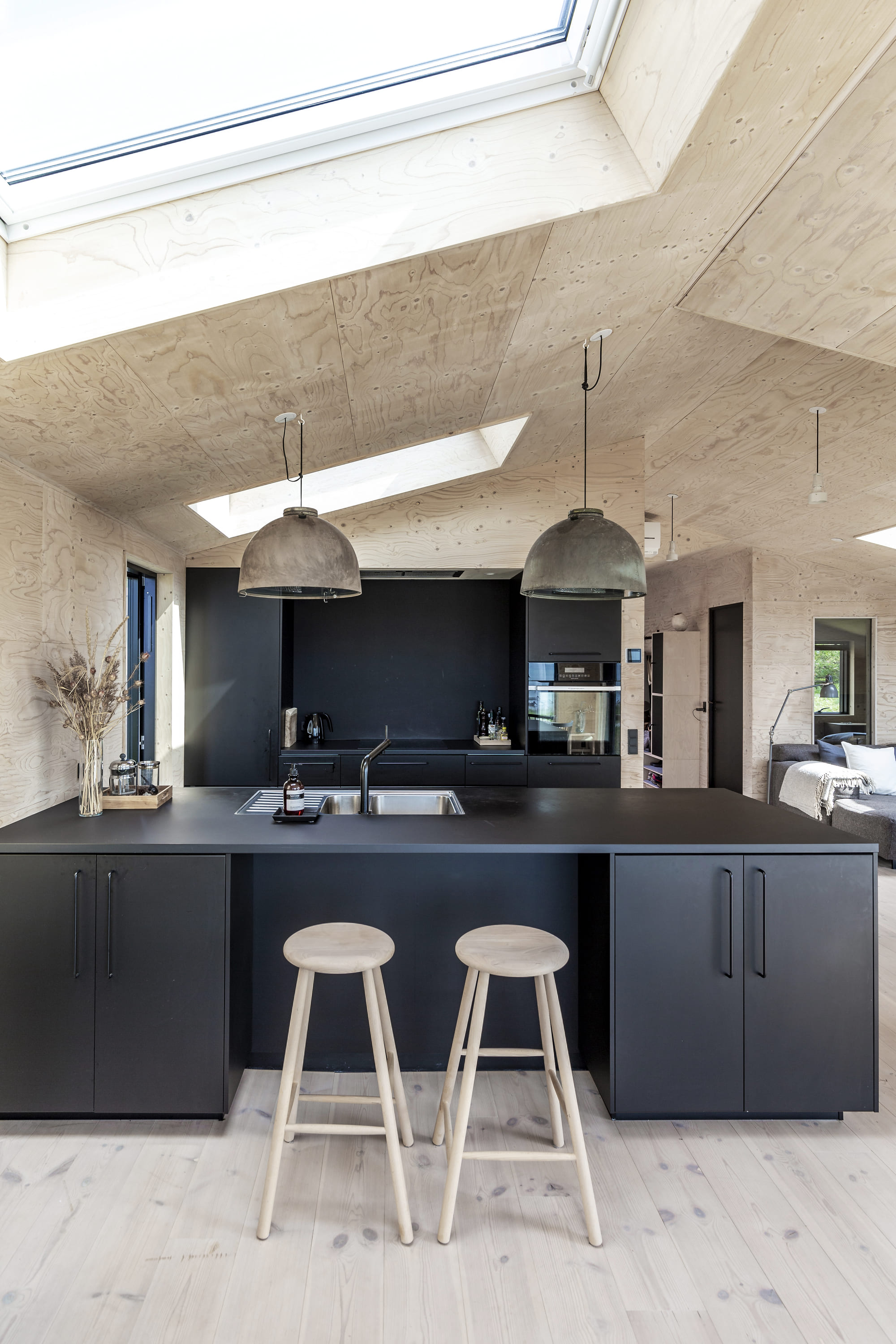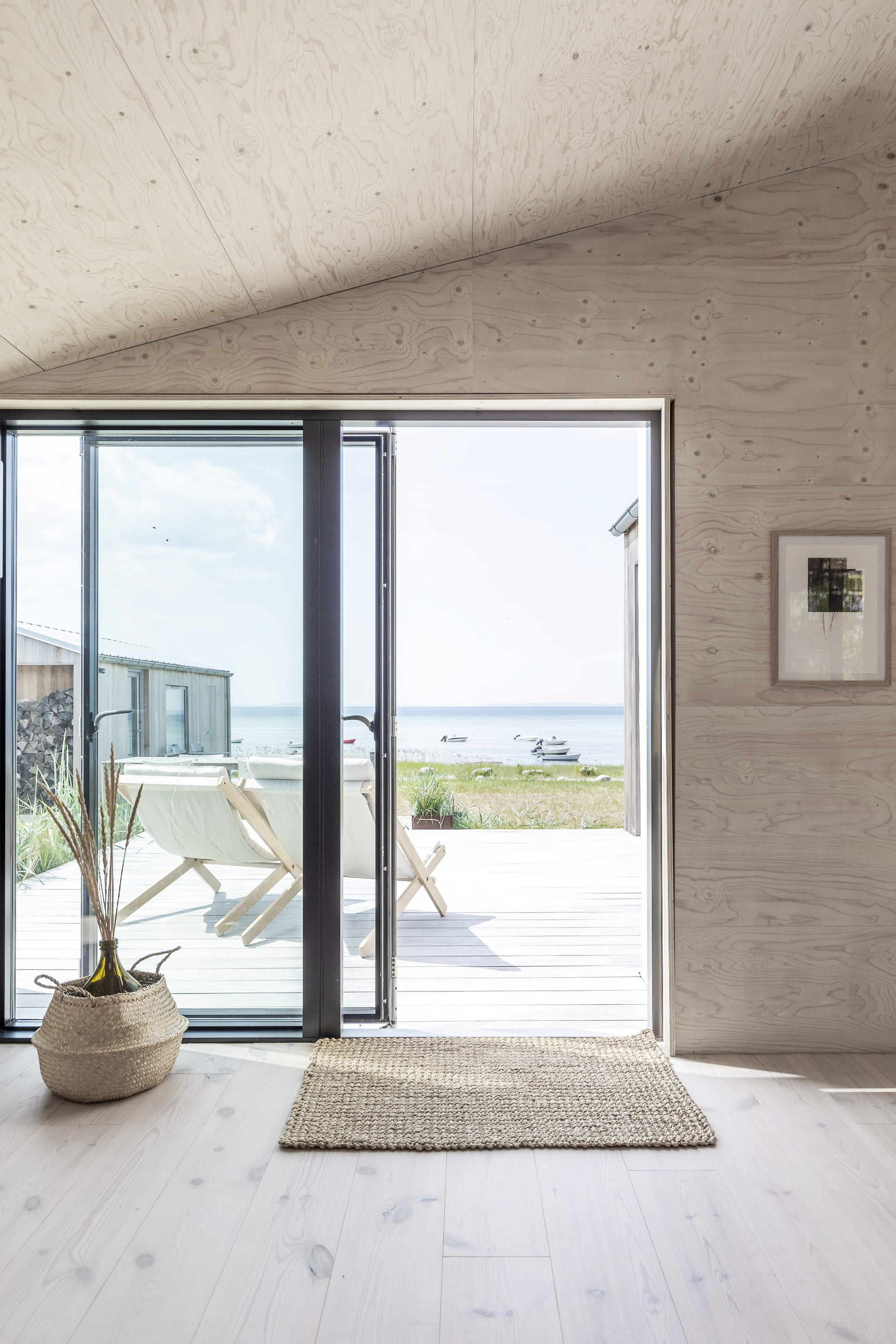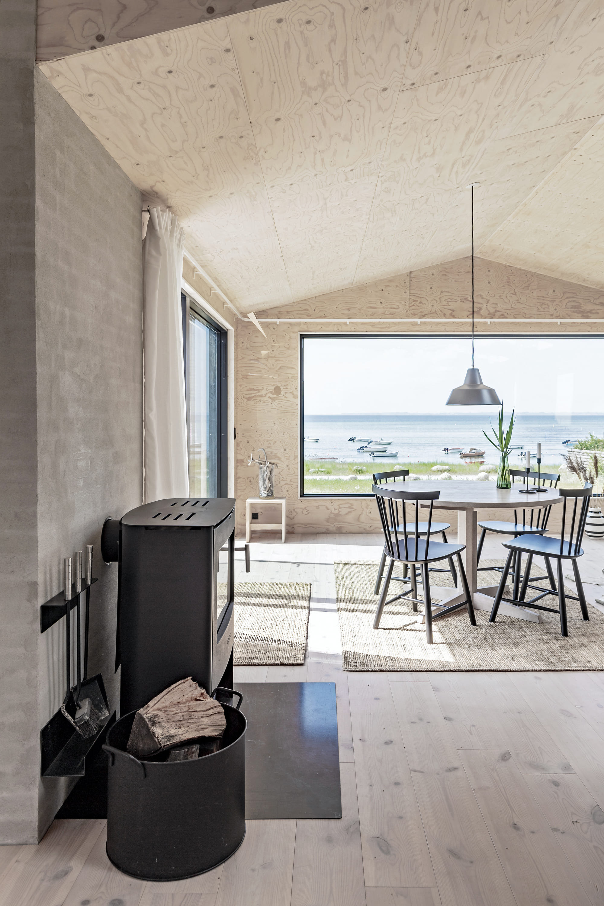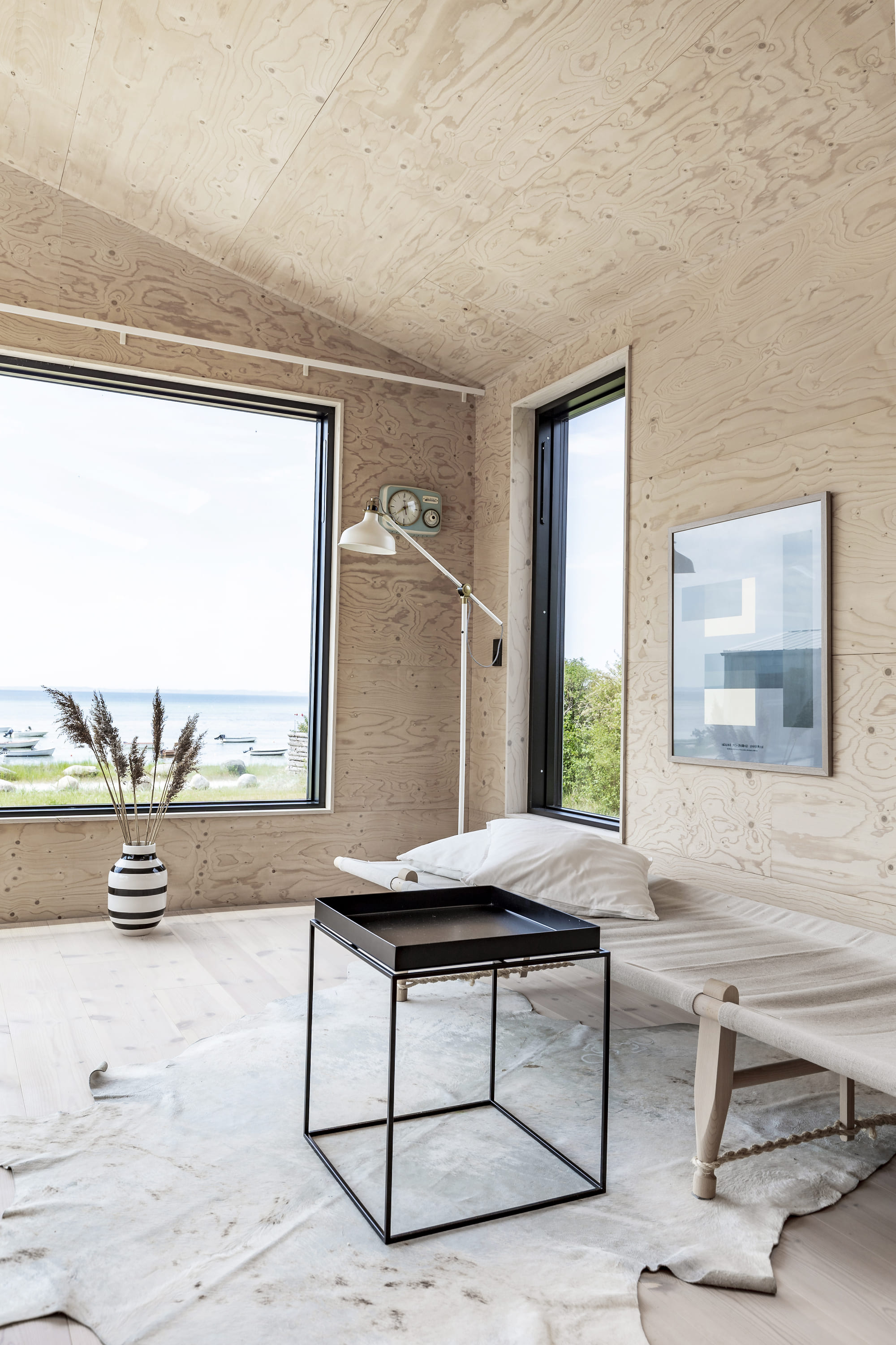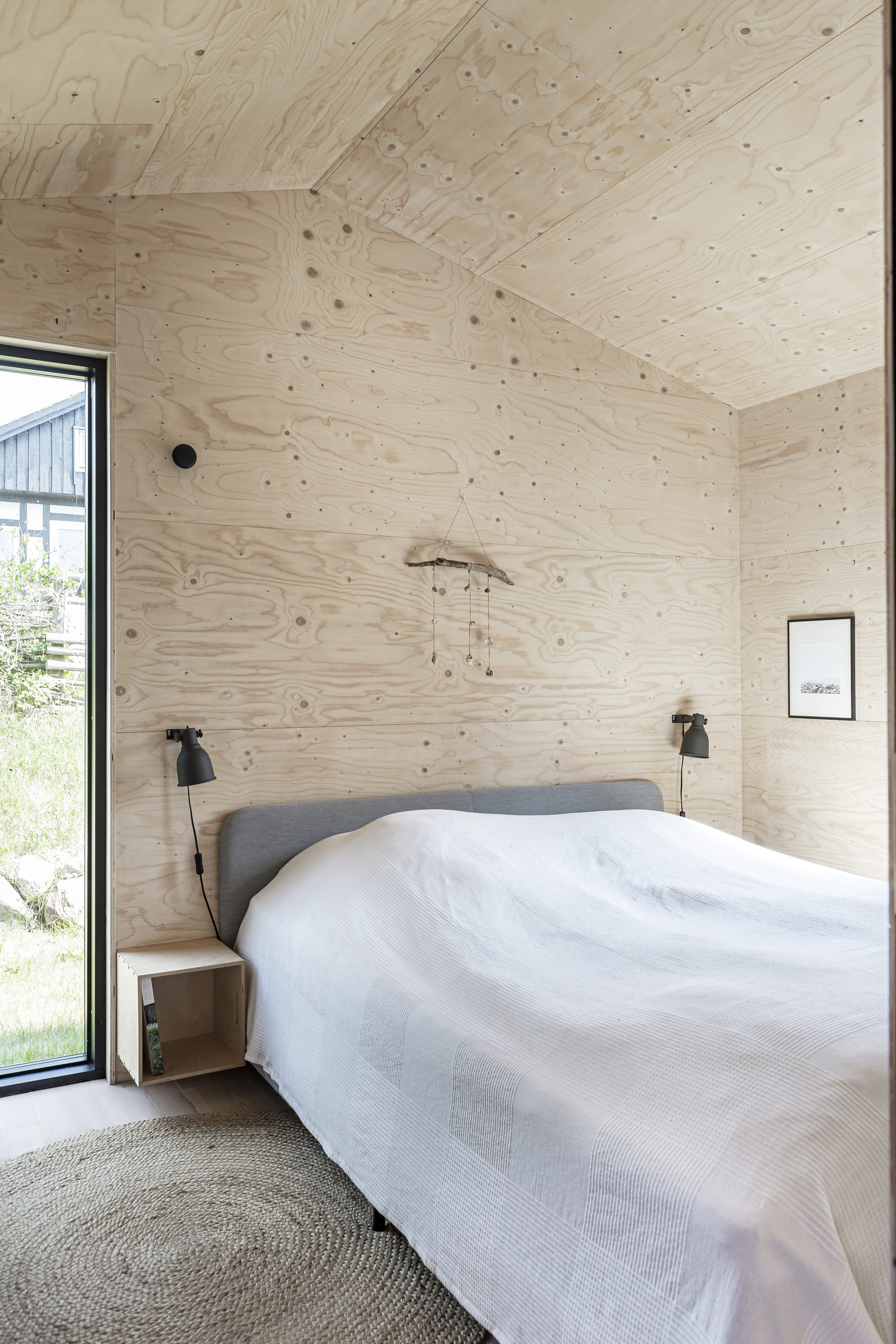 Huset er 90 m2 og renoveret, om og tilbygget i Cedertræ, med Vinduer i rustfrit stål. Indvendig er det skabt med krydsfinersplader og har derved beholdt varmen fra det oprindelige sommerhus. Der er kig til Fjorden fra alle fællesrum, og alle rum har en forbindelse til grunden der er blot knap 600m2.