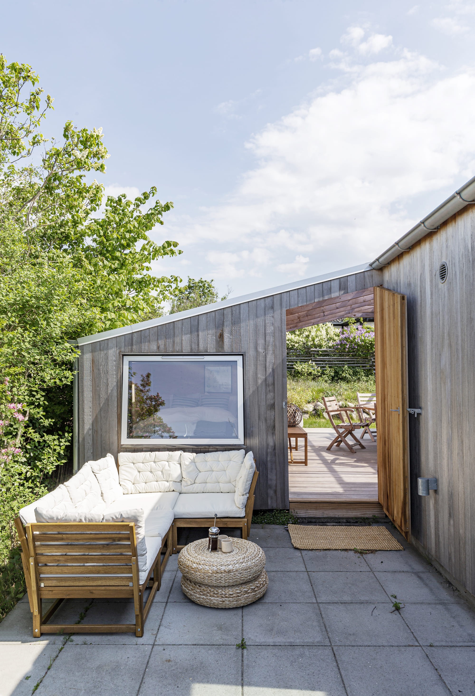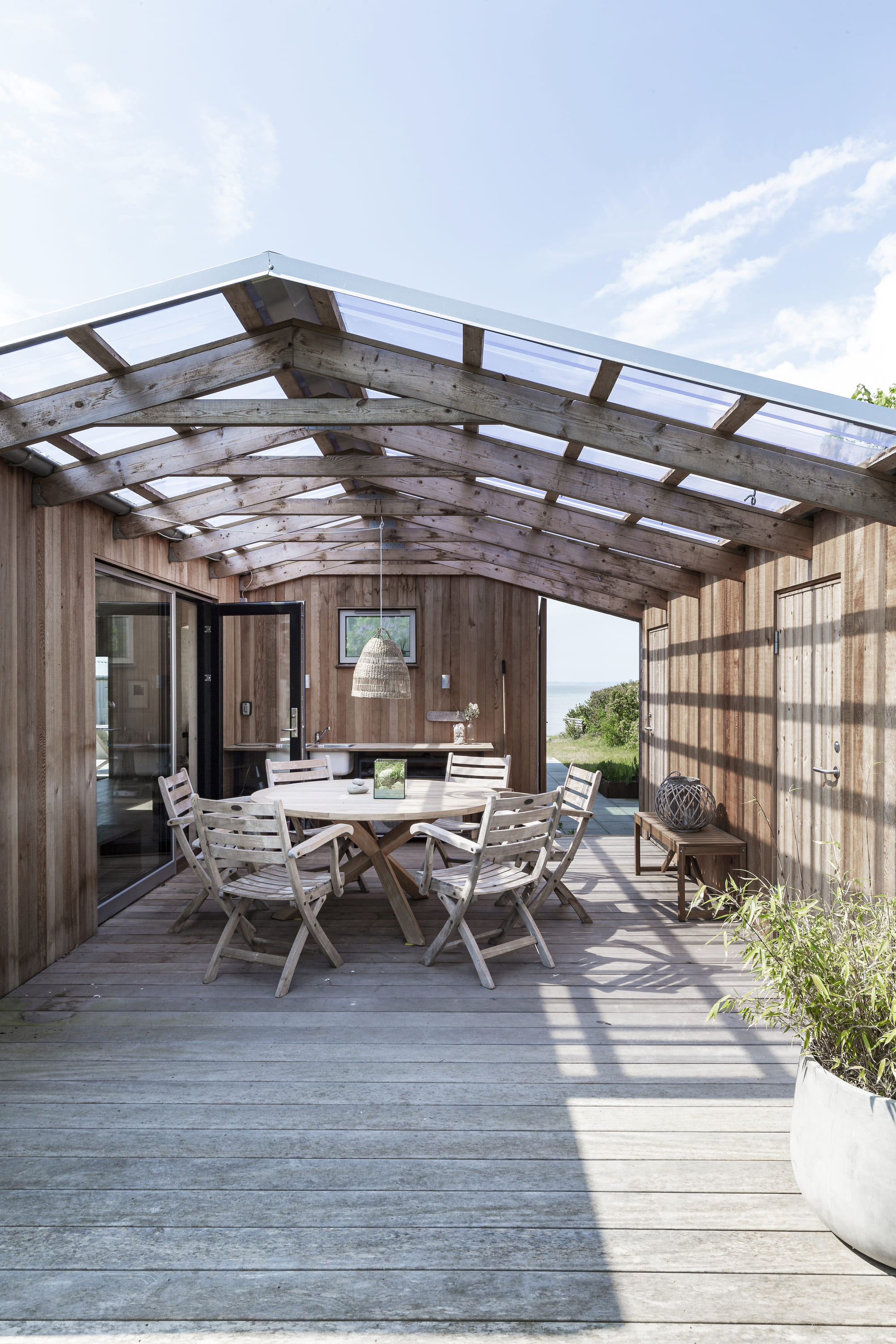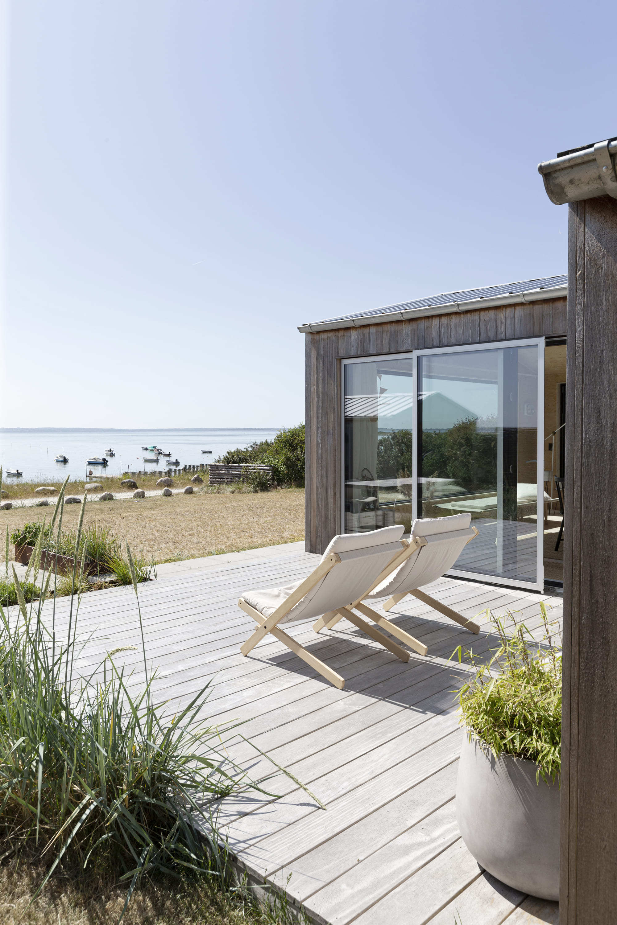 Sommerhuset er ombygget og tilbygget med respekt for denne linje og udvidet med sine knopskydninger rum for rum, for at bevare historien om de gamle, små sommerhuse i området, men ombygget med respekt for beliggenheden i fjordlandskabet, med de dæmpede strandfarver som reference til de benyttede materialer.
